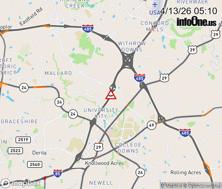 The shoulder is closed before Exit 46 ( Mallard Creek Church Road). Updated: Mon 4/13/26 5:10 AM EDT ![]() Updated: Mon 4/13/26 5:10 AM EDT |