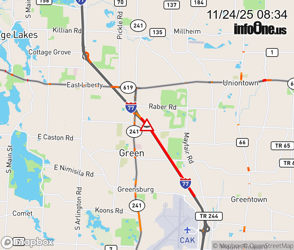 The left shoulder is blocked on I-77 North beyond Akron-Canton Airport, due to a crash. Updated: Mon 11/24/25 8:34 AM EST ![]() Updated: Mon 11/24/25 8:34 AM EST |