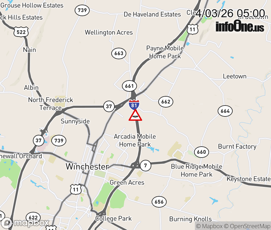 On I-81 South at mile marker 317.2 in the County of Frederick, motorists can expect delays due to a tractor trailer crash. Traffic backups are approximately 0.5 mile. Updated: Fri 4/3/26 5:00 AM EDT ![]() Updated: Fri 4/3/26 5:00 AM EDT |