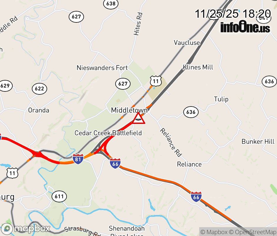 On I-81 North at mile marker 302 in the County of Frederick, motorists can expect delays due to a vehicle crash. Traffic backups are approximately 2.0 miles. Updated: Tue 11/25/25 6:20 PM EST ![]() Updated: Tue 11/25/25 6:20 PM EST |