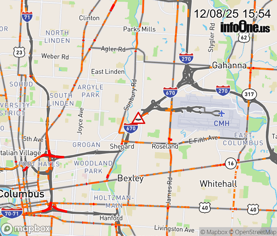 The right shoulder is blocked on I-670/US-62 West beyond Airport/Cassady Ave/Stelzer Rd, due to a crash. Updated: Mon 12/8/25 3:54 PM EST ![]() Updated: Mon 12/8/25 3:54 PM EST |