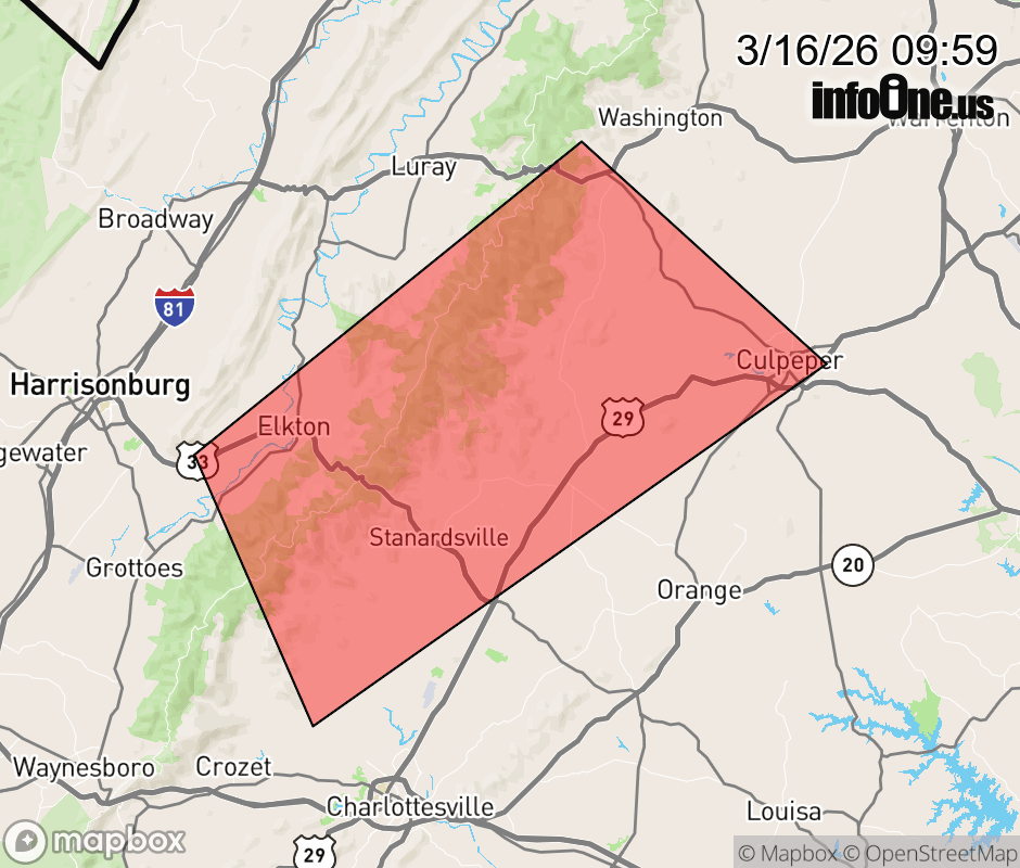 Canceled 3/16/26 10:14 AM Severe Thunderstorm Warning issued March 16 at 9:58AM EDT until March 16 at 10:45AM EDT by NWS Baltimore MD/Washington DC SVRLWX The National Weather Service in Sterling Virginia has issued a * Severe Thunderstorm Warning for... Madison County in northwestern Virginia... Southeastern Rockingham County in western Virginia... Southeastern Page County in northwestern Virginia... North central Albemarle County in central Virginia... Southwestern Rappahannock County in northwestern Virginia... Greene County in central Virginia... Southwestern Culpeper County in northern Virginia... * Until 1045 AM EDT. * At 957 AM EDT, a severe thunderstorm was located 7 miles north of Free Union, or 16 miles north of Charlottesville, moving northeast at 60 mph. HAZARD...60 mph wind gusts. SOURCE...Radar indicated. IMPACT...Damaging winds will cause some trees and large branches to fall. This could injure those outdoors, as well as damage homes and vehicles. Roadways may become blocked by downed trees. Localized power outages are possible. Unsecured light objects may become projectiles. * Locations impacted include... Culpeper, Madison, Massanutten, Stanardsville, Sperryville, Free Union, Big Meadows, Elkton, Ruckersville, Brightwood, Rocky Bar, Oakpark, Haywood, Syria, Cardova, Reva, Amicus, Leon, Mcgaheysville, and Hood. ![]() |