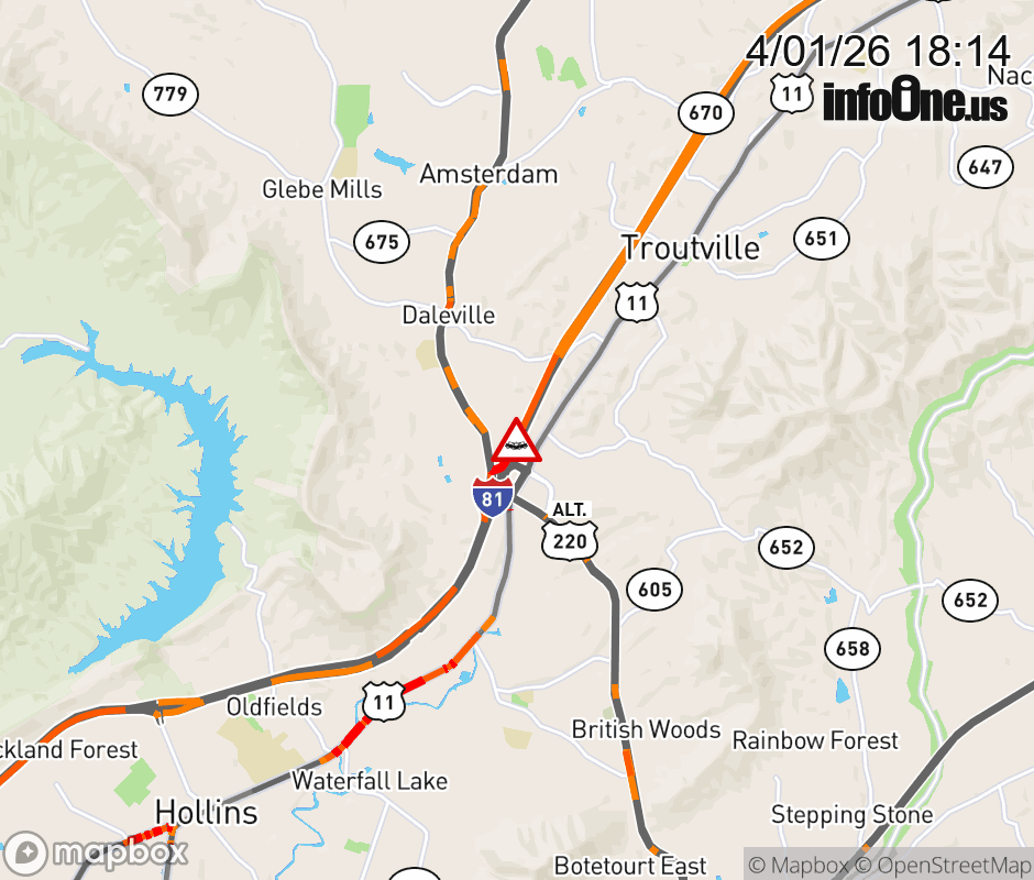 On I-81 at mile marker 150.7 in the County of Botetourt, motorists can expect delays due to a tractor trailer crash. The south right shoulder is closed. ![]() |