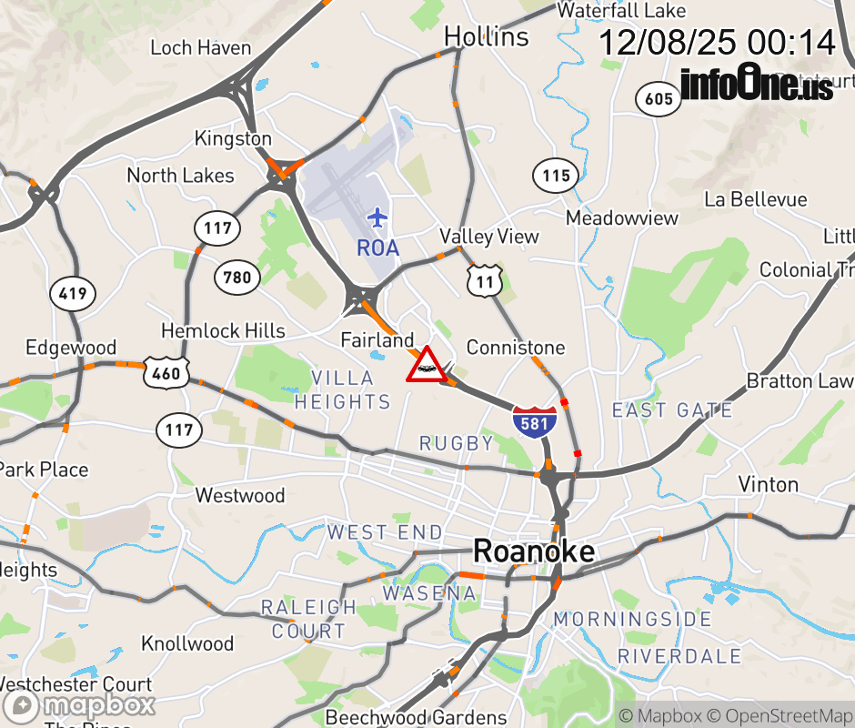 On I-581 at mile marker 3 in the City of Roanoke, motorists can expect delays due to a vehicle crash. The south left shoulder, left lane, center lane, and right shoulder are closed. Updated: Mon 12/8/25 12:14 AM EST ![]() Updated: Mon 12/8/25 12:14 AM EST |