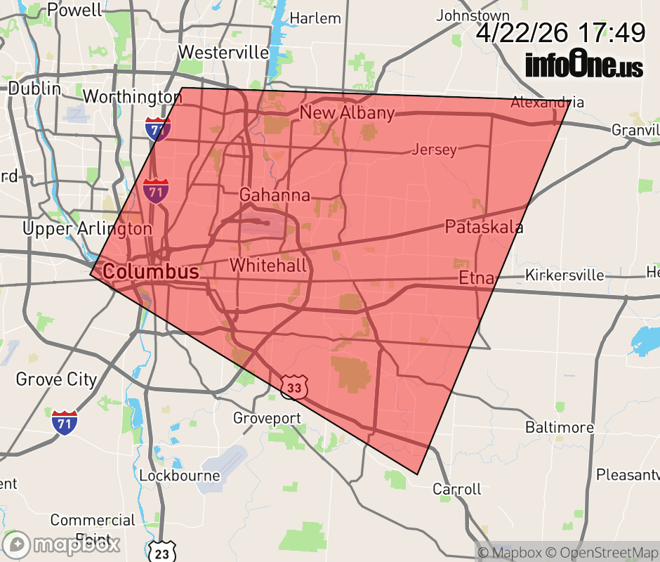 Canceled 4/22/26 6:12 PM Severe Thunderstorm Warning issued April 22 at 5:48PM EDT until April 22 at 6:15PM EDT by NWS Wilmington OH At 547 PM EDT, a severe thunderstorm was located over Easton, moving southeast at 10 mph. HAZARD...60 mph wind gusts and quarter size hail. SOURCE...Radar indicated. IMPACT...Minor hail damage to vehicles is possible. Expect wind damage to trees and power lines. Locations impacted include... Columbus, Westerville, Reynoldsburg, Gahanna, Pickerington, Bexley, Pataskala, Canal Winchester, Groveport, Minerva Park, Ohio State University, Beechwood Trails, Easton, Summit Station, Whitehall, Etna, New Albany, Grandview Heights, Jersey, and Alexandria. This includes the following Interstates... I-70 in Ohio near mile marker 97, and between mile markers 99 and 119. I-71 in Ohio between mile markers 106 and 115. ![]() |