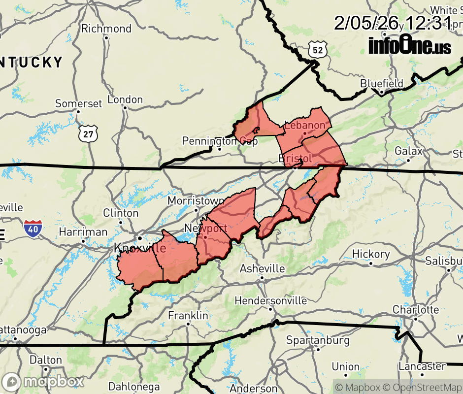 Canceled 2/5/26 12:33 PM Winter Weather Advisory issued February 5 at 12:30PM EST until February 7 at 7:00AM EST by NWS Morristown TN * WHAT... Mixed precipitation expected. Total snow accumulations up to 4 inches and ice accumulations around a light glaze. Winds gusting as high as 40 mph. * WHERE... Portions of east Tennessee and southwest Virginia. * WHEN... From 1 PM Friday to 7 AM EST Saturday. * IMPACTS... Plan on slippery road conditions. The hazardous conditions could impact the Friday evening commute. ![]() |