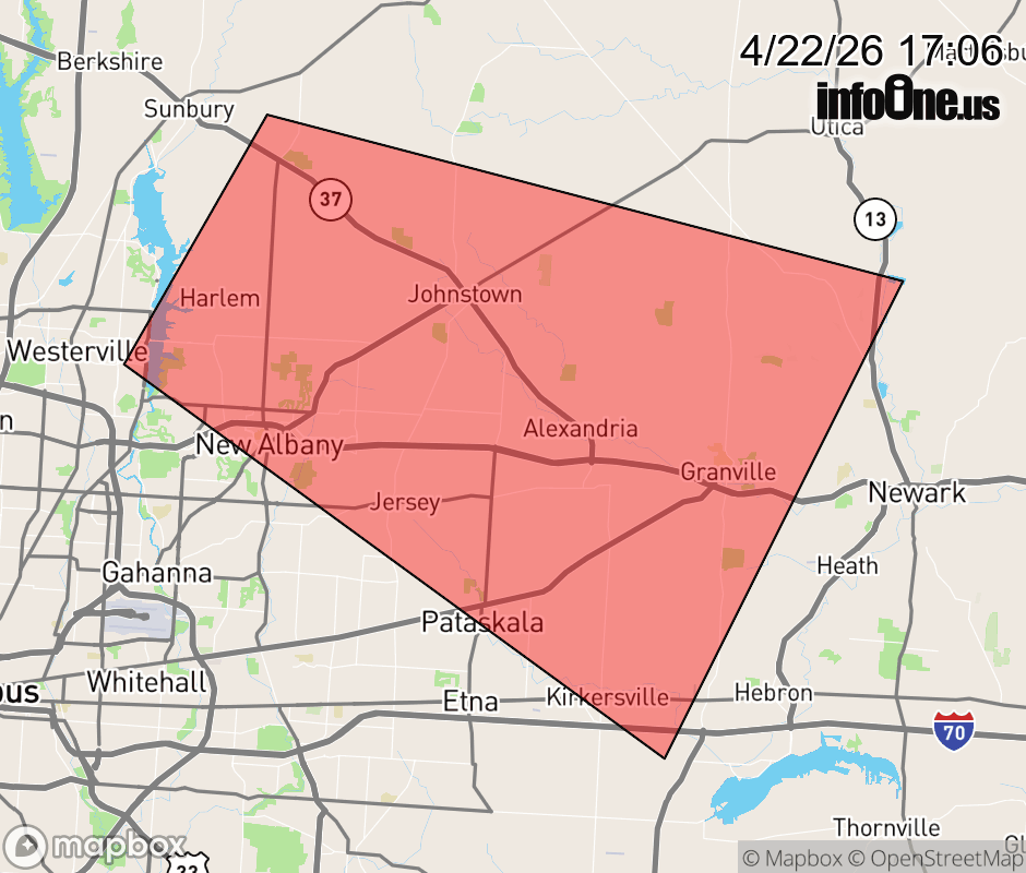 Canceled 4/22/26 5:30 PM Special Weather Statement issued April 22 at 5:05PM EDT by NWS Wilmington OH At 505 PM EDT, a strong thunderstorm was located near Johnstown, moving southeast at 25 mph. HAZARD...Wind gusts up to 40 mph and half inch hail. SOURCE...Radar indicated. IMPACT...Gusty winds could knock down tree limbs and blow around unsecured objects. Hail may cause minor damage to vegetation. Locations impacted include... Newark, Westerville, Granville, Pataskala, Johnstown, Beechwood Trails, Granville South, New Albany, Jersey, Kirkersville, Alexandria, Fredonia, State Route 310 at State Route 161, and Center Village. This includes I-70 in Ohio between mile markers 124 and 125. If outdoors, consider seeking shelter inside a sturdy building. To report hazardous weather conditions, go to our website at weather.gov/iln and submit your report via social media, when you can do so safely. ![]() |