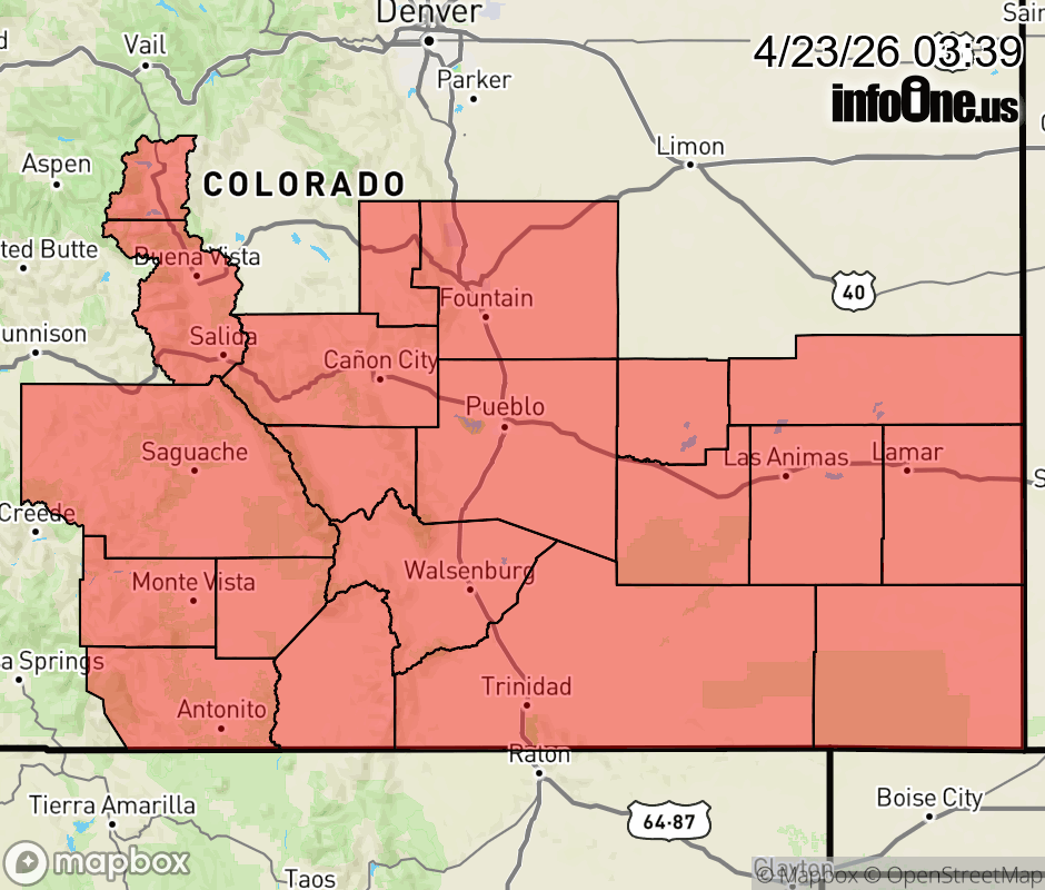 Canceled 4/23/26 2:16 PM Red Flag Warning issued April 23 at 1:38AM MDT until April 23 at 9:00PM MDT by NWS Pueblo CO * AFFECTED AREA... Fire Weather Zones 220, 221, 222, 224, 225, 226, 227, 228, 229, 230, 231, 232, 233, 234, 235, 236 and 237. * TIMING... For the Red Flag Warning, from 11 AM this morning to 9 PM MDT this evening. For the Fire Weather Watch, from Friday morning through Friday evening. * WINDS... West 15 to 25 mph with gusts up to 45 mph. * RELATIVE HUMIDITY... As low as 7 percent. * IMPACTS... Elevated fire danger is expected. Fires will catch and spread rapidly and erratically. ![]() |