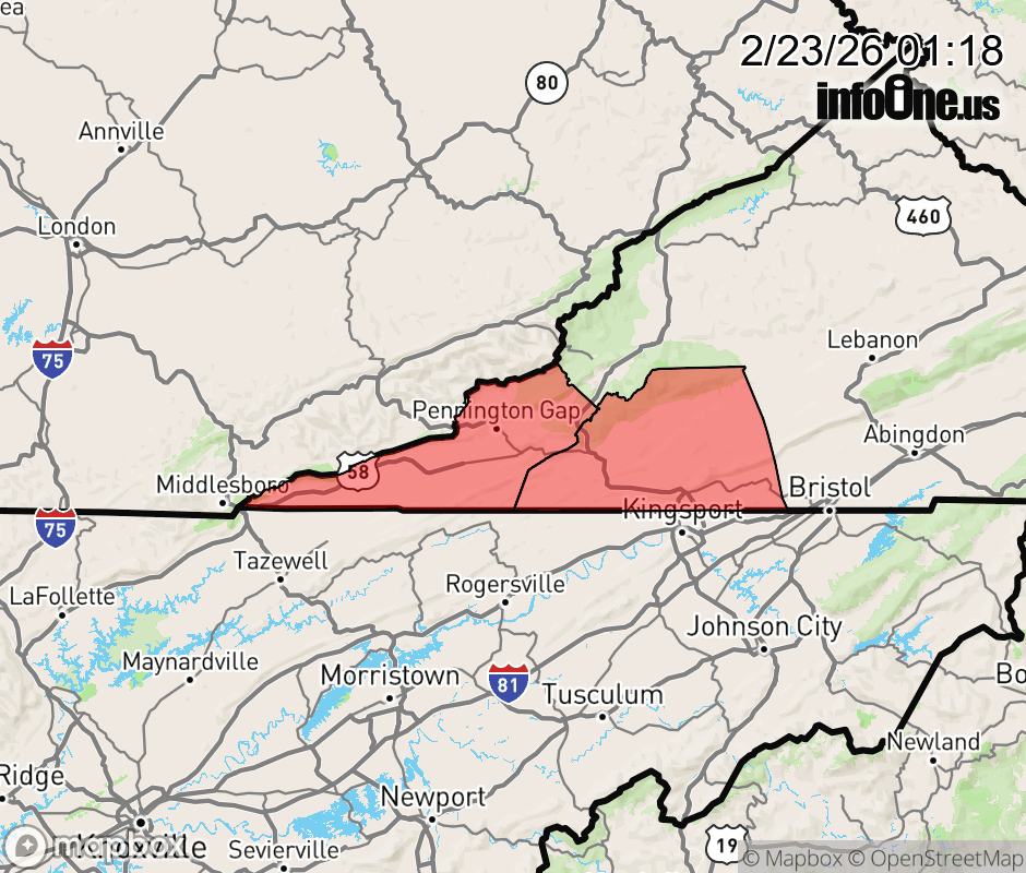 Canceled 2/23/26 1:24 PM Winter Weather Advisory issued February 23 at 1:16AM EST until February 24 at 12:00AM EST by NWS Morristown TN * WHAT... Occasional snow showers continue through tonight. Total accumulations of a dusting up to 2 inches are possible for elevations 2000 feet or greater. Lesser accumulations of a dusting to an inch are expected for lower elevations. * WHERE... Lee and Scott VA Counties. * WHEN... Until midnight EST tonight. * IMPACTS... Plan on slippery road conditions. The hazardous conditions could impact the Monday morning and evening commutes. ![]() |