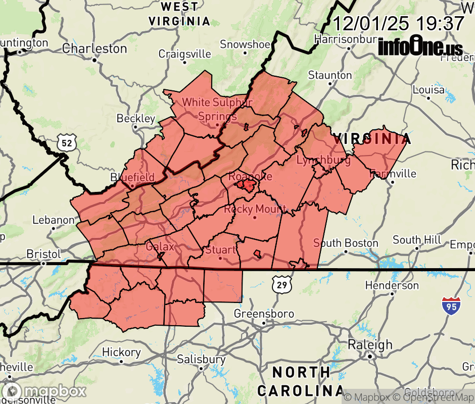 Winter Weather Advisory issued December 1 at 7:35PM EST until December 2 at 12:00PM EST by NWS Blacksburg VA * WHAT... Mixed precipitation expected, with a majority of the precipitation expected in the form of freezing rain. Total snow accumulations up to half an inch and ice accumulations around two tenths of an inch. * WHERE... Portions of north central and northwest North Carolina, central, south central, southwest, and west central Virginia, and southeast West Virginia. * WHEN... Until noon EST Tuesday. * IMPACTS... Roads, and especially bridges and overpasses, will likely become slick and hazardous. Plan on slippery road conditions. The hazardous conditions could impact the Tuesday morning commute. ![]() |
