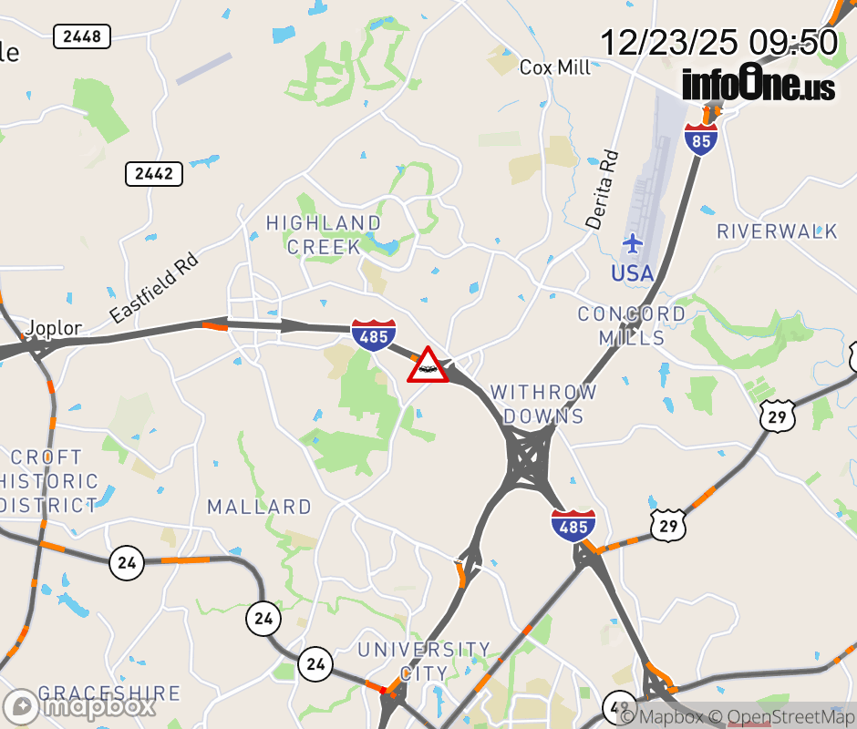 The right shoulder is closed at Exit 28 (Mallard Creek Rd.). Updated: Tue 12/23/25 9:50 AM EST ![]() Updated: Tue 12/23/25 9:50 AM EST |