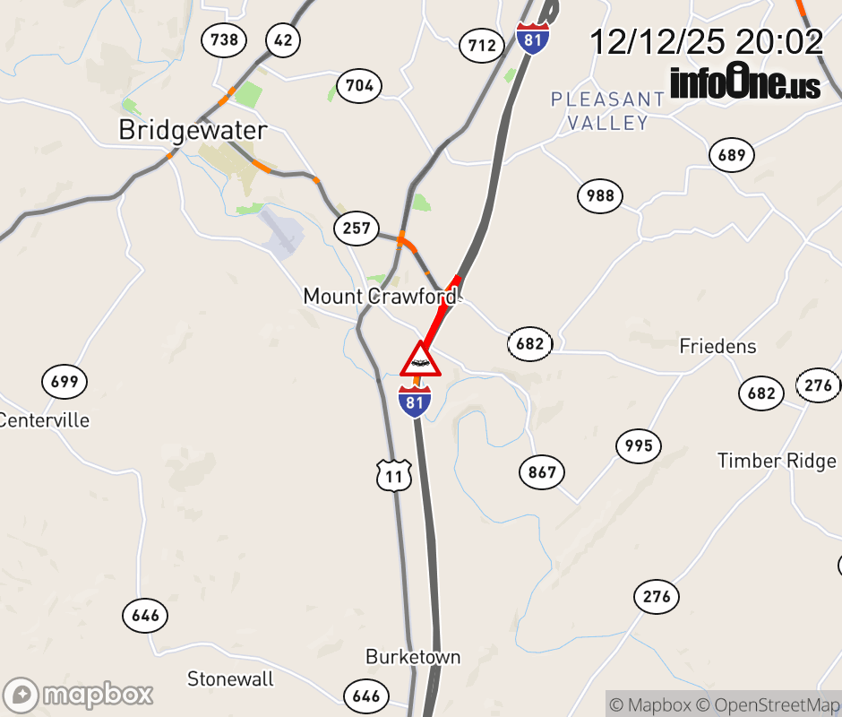 On I-81 at mile marker 239.3 in the County of Rockingham, motorists can expect delays due to a vehicle crash. The south right shoulder is closed. Updated: Fri 12/12/25 8:02 PM EST ![]() Updated: Fri 12/12/25 8:02 PM EST |
