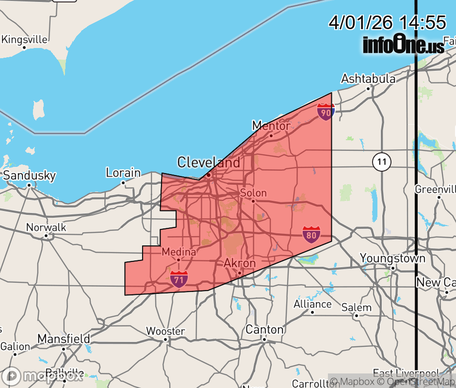 Canceled 4/1/26 4:50 PM Flood Warning issued April 1 at 2:54PM EDT until April 1 at 5:15PM EDT by NWS Cleveland OH * WHAT... Flooding caused by excessive rainfall continues. * WHERE... A portion of northeast Ohio, including the following counties, Cuyahoga, Geauga, Lake, Medina, Portage and Summit. * WHEN... Until 515 PM EDT. * IMPACTS... Flooding of rivers, creeks, streams, and other low-lying and flood-prone locations is imminent or occurring. Streams continue to rise due to excess runoff from earlier rainfall. * ADDITIONAL DETAILS... - At 254 PM EDT, Doppler radar indicated an area of very heavy rainfall across the warned area. Up to 0.5 inches of rain have fallen. - Additional rainfall amounts of 0.5 to 1 inch are possible in the warned area. - Some locations that will experience flooding include... Cleveland, Akron, Medina, Painesville, Willowick, Ravenna, Chardon, Fairport Harbor, Parma, Lakewood, Cuyahoga Falls, Euclid, Mentor, Cleveland Heights, Strongsville, Brunswick, Westlake, North Royalton, Kent and Solon. - Please visit www.weather.gov/safety/flood for flood safety and preparedness information. ![]() |