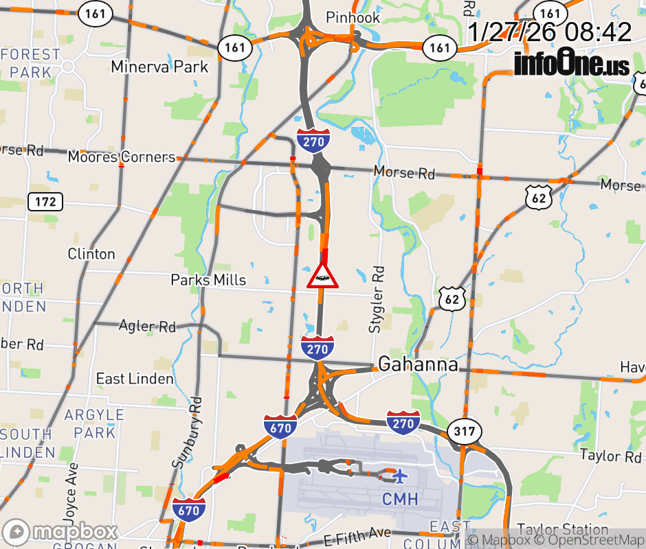 The right lane is blocked on I-270 North Collector at McCutcheon Rd, due to a crash. Updated: Tue 1/27/26 8:42 AM EST ![]() Updated: Tue 1/27/26 8:42 AM EST |