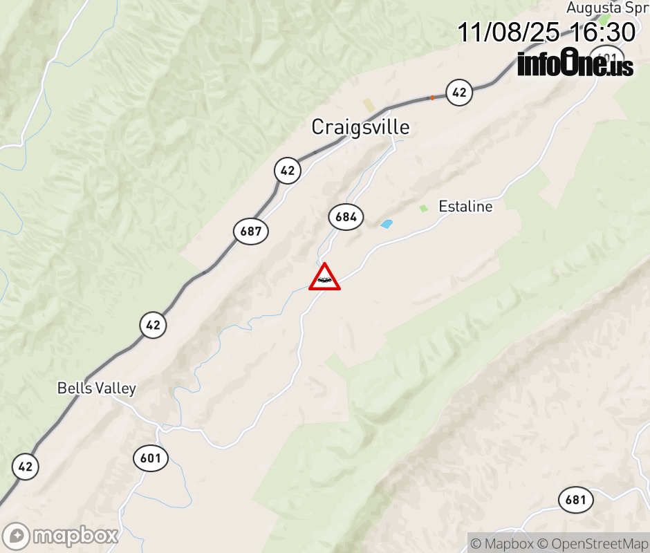 On Rt. 683 East in the County of Augusta, in the vicinity of Little River Rd; Rt. 684N/S (Augusta County); Rt. 683E (Augusta County), Rt. 684N/S (Augusta County), motorists can expect delays due to a vehicle crash. Updated: Sat 11/8/25 4:30 PM EST ![]() Updated: Sat 11/8/25 4:30 PM EST |