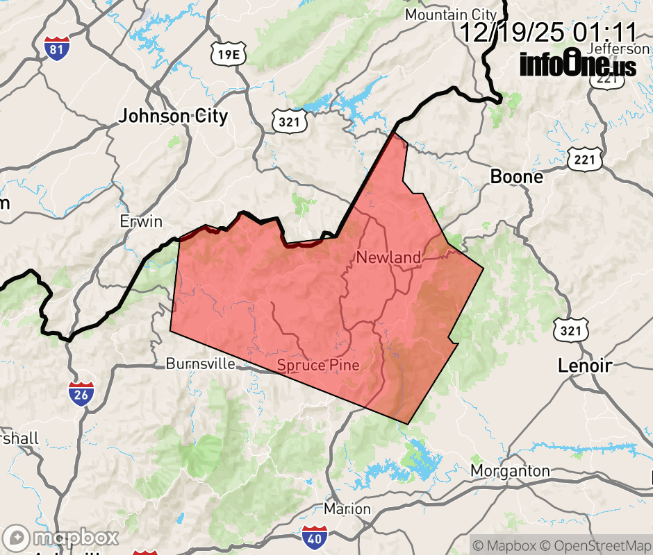 Canceled 12/19/25 2:00 AM Special Weather Statement issued December 19 at 1:10AM EST by NWS Greenville-Spartanburg SC At 110 AM EST, Doppler radar was tracking strong thunderstorms along a line extending from 5 miles northeast of Elizabethton to 7 miles south of Erwin. Movement was east at 40 mph. HAZARD...Wind gusts of 50 to 55 mph. SOURCE...Radar indicated. IMPACT...Gusty winds could knock down tree limbs and blow around unsecured objects. Locations impacted include... Spruce Pine, Newland, Banner Elk, Elk Park, Bakersville, Beech Mountain In Avery County, Crossnore, Sugar Mountain, Linville Falls, and B.R. Parkway-Linville Falls To Grandfather. ![]() |
