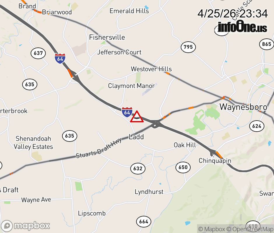 On I-64 at mile marker 94 in the County of Augusta, motorists can expect delays due to a vehicle crash. The east exit 94 narrows. Updated: Sat 4/25/26 11:34 PM EDT ![]() Updated: Sat 4/25/26 11:34 PM EDT |