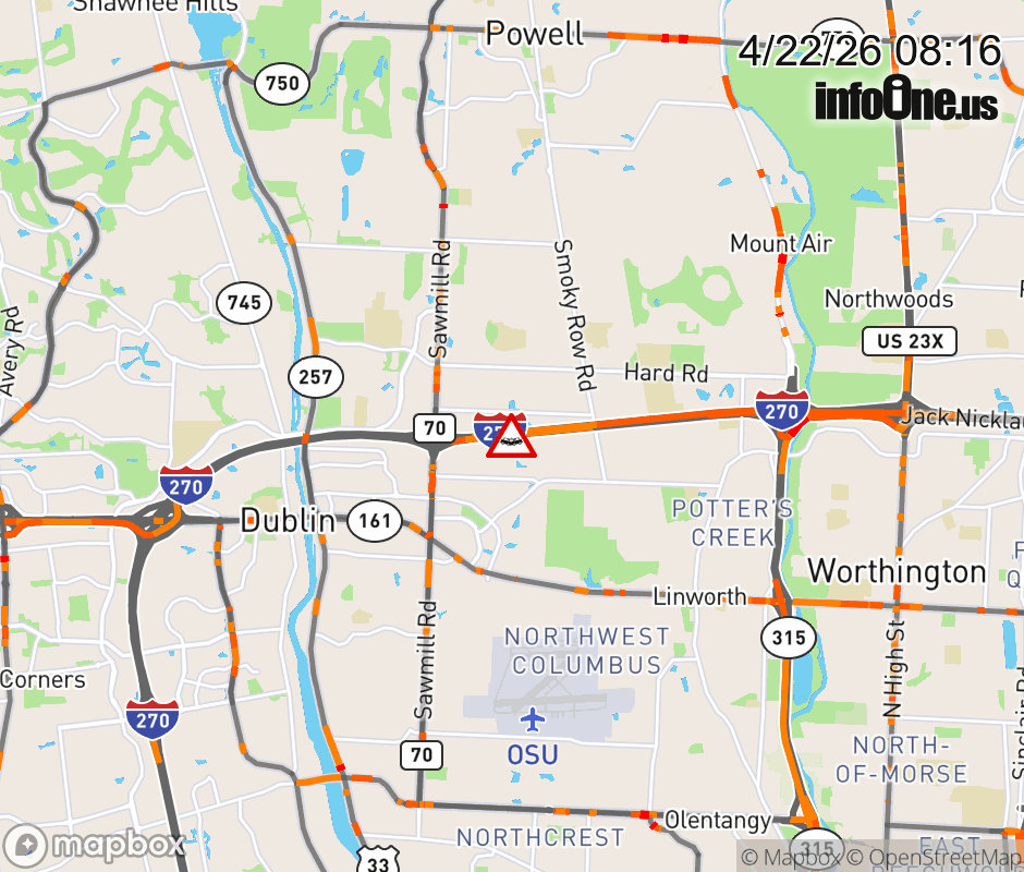 The right shoulder is blocked on I-270 East beyond Sawmill Rd, due to a crash. Updated: Wed 4/22/26 8:16 AM EDT ![]() Updated: Wed 4/22/26 8:16 AM EDT |