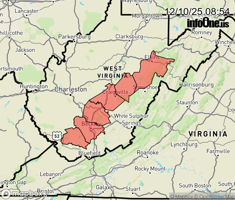 Canceled 12/10/25 5:00 PM Winter Weather Advisory issued December 10 at 8:52AM EST until December 11 at 10:00AM EST by NWS Charleston WV * WHAT... Snow expected. Total snow accumulations between 2 and 4 inches. Winds gusting as high as 45 mph. * WHERE... Portions of northeast, southeast, and southern West Virginia. * WHEN... From 3 PM this afternoon to 10 AM EST Thursday. * IMPACTS... Plan on slippery road conditions. The hazardous conditions could impact the Wednesday evening and Thursday morning commutes. Gusty winds could bring down tree branches. ![]() |