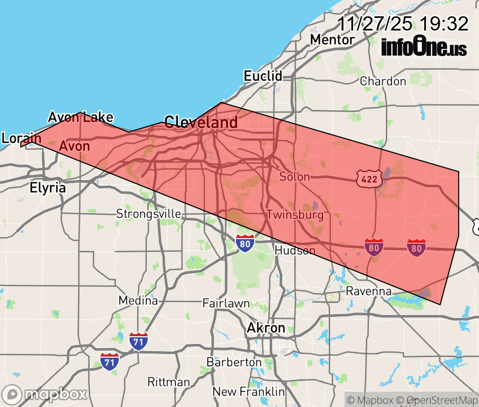 Canceled 11/27/25 9:00 PM Special Weather Statement issued November 27 at 7:31PM EST by NWS Cleveland OH At 730 PM EST, radar indicated an intense lake effect snow band over Lakewood, or near Cleveland, moving east at 30 mph. HAZARDS INCLUDE... Winds to 30 mph... Visibility rapidly dropping to less than a quarter of a mile... Locations impacted include... Cleveland, Lorain, Ravenna, Parma, Lakewood, Cleveland Heights, Westlake, North Royalton, North Ridgeville, Solon, Avon Lake, Hudson, Twinsburg, Streetsboro, Warrensville Heights, Macedonia, South Russell, Garrettsville, Highland Hills, and Mantua. ![]() |