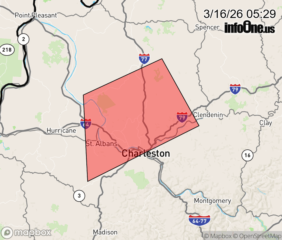 Canceled 3/16/26 5:43 AM Severe Thunderstorm Warning issued March 16 at 5:28AM EDT until March 16 at 6:00AM EDT by NWS Charleston WV SVRRLX The National Weather Service in Charleston West Virginia has issued a * Severe Thunderstorm Warning for... Northeastern Putnam County in western West Virginia... Northwestern Kanawha County in central West Virginia... Northeastern Lincoln County in central West Virginia... Southwestern Roane County in central West Virginia... Southeastern Jackson County in northwestern West Virginia... * Until 600 AM EDT. * At 528 AM EDT, a severe thunderstorm was located over Nitro, moving east at 40 mph. HAZARD...60 mph wind gusts. SOURCE...Radar indicated. IMPACT...Expect damage to roofs, siding, and trees. * Locations impacted include... Charleston, Nitro, Winfield, Jefferson, South Charleston, St. Albans, Dunbar, Sissonville, Eleanor, Poca, Cross Lanes, Alum Creek, Institute, Tornado, Elkview, Pinch, Teays Valley, Bancroft, Kentuck, and Liberty. This includes the following highways... Interstate 79 between mile markers 1 and 14. Interstate 77 in West Virginia between mile markers 101 and 124. Interstate 64 in West Virginia between mile markers 40 and 57. Route 119 between mile markers 75 and 78, and near mile marker 80. ![]() |