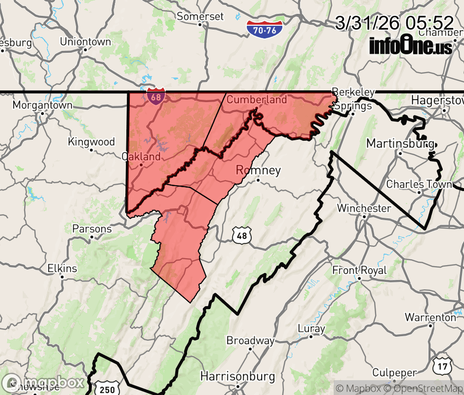 Canceled 3/31/26 9:00 AM Special Weather Statement issued March 31 at 5:50AM EDT by NWS Baltimore MD/Washington DC * WHAT... West to southwest winds 15 to 25 mph with occasional gusts of 40 to 50 mph near and above 3000 feet. * WHERE... In Maryland, Eastern Garrett and Extreme Western Allegany Counties. In West Virginia, Western Grant and Western Mineral Counties. * WHEN... Until 9 AM EDT this morning. * IMPACTS... Gusty winds may blow around unsecured objects. Tree limbs could be blown down and a few power outages may result. ![]() |
