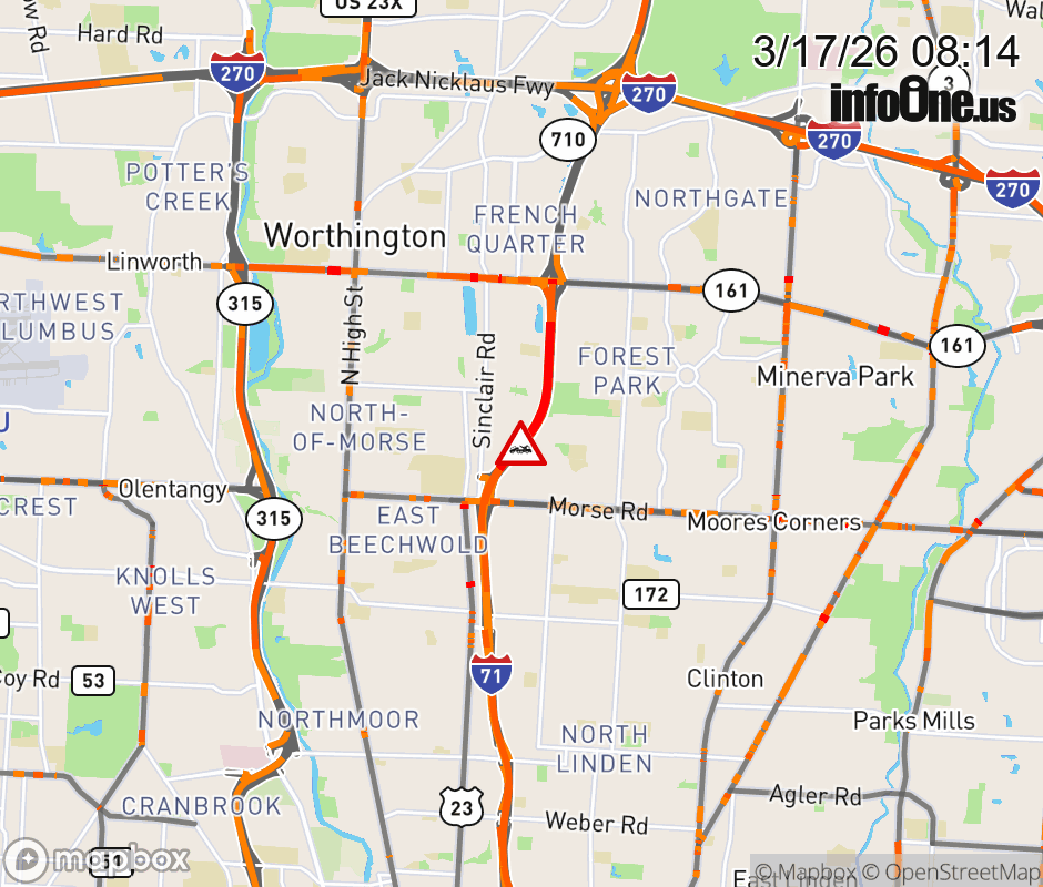 The left lane is blocked on I-71 South beyond SR-161/Dublin Granville Rd, due to a disabled vehicle. Updated: Tue 3/17/26 8:14 AM EDT ![]() Updated: Tue 3/17/26 8:14 AM EDT |