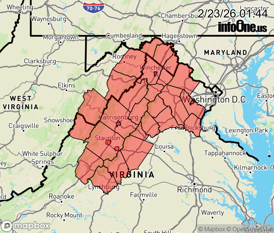 Canceled 2/23/26 7:45 AM Special Weather Statement issued February 23 at 1:43AM EST by NWS Baltimore MD/Washington DC With light snow coming to an end this morning, any lingering moisture on untreated surfaces such as roads, bridges, overpasses, sidewalks, etc. are likely to freeze as temperatures fall below freezing over the next couple hours. This could lead to hazardous travel conditions, so use caution if on the roads. ![]() |