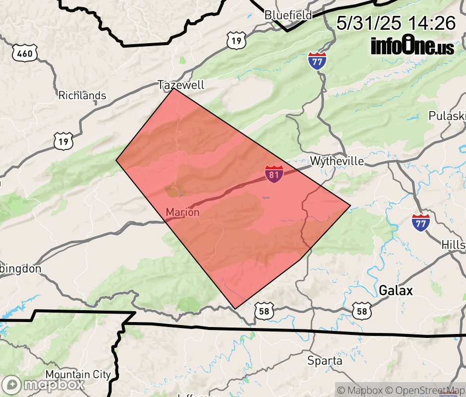 Canceled 5/31/25 3:00 PM Special Weather Statement issued May 31 at 2:24PM EDT by NWS Blacksburg VA At 224 PM EDT, Doppler radar was tracking a strong thunderstorm over Asberrys, or 8 miles south of Tazewell, moving southeast at 40 mph. HAZARD...Wind gusts up to 40 mph and pea size hail. SOURCE...Radar indicated. IMPACT...Gusty winds could knock down tree limbs and blow around unsecured objects. Locations impacted include... Marion... Rural Retreat... Mount Rogers National Recreation Area... Speedwell... Sugar Grove... Troutdale... and Nebo. ![]() |