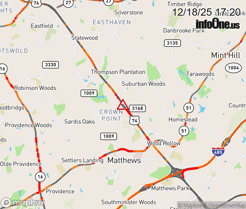 There is heavy congestion at the intersection of US 74 and Sardis Rd N. ![]() Updated: Thu 12/18/25 5:20 PM EST |