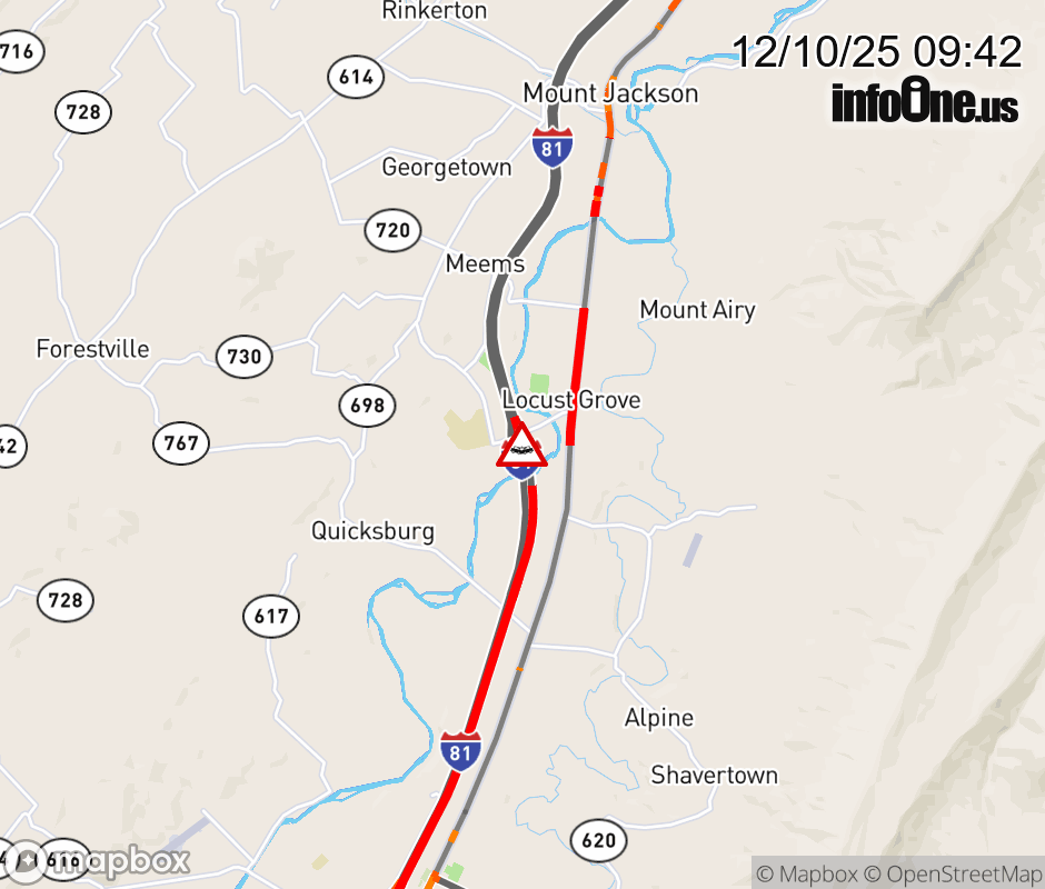 On I-81 North at mile marker 269 in the County of Shenandoah, motorists can expect delays due to a tractor trailer crash. Traffic backups are approximately 6.5 miles. Updated: Wed 12/10/25 9:42 AM EST ![]() Updated: Wed 12/10/25 9:42 AM EST |