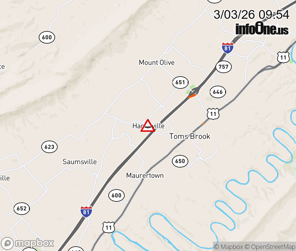 On Rt. 655 in the County of Shenandoah, in the vicinity of Dean Rd; Rt. 642N/S (Shenandoah County), motorists can expect delays due to a vehicle crash. All east lanes are closed. All west lanes are closed. Updated: Tue 3/3/26 9:54 AM EST ![]() Updated: Tue 3/3/26 9:54 AM EST |