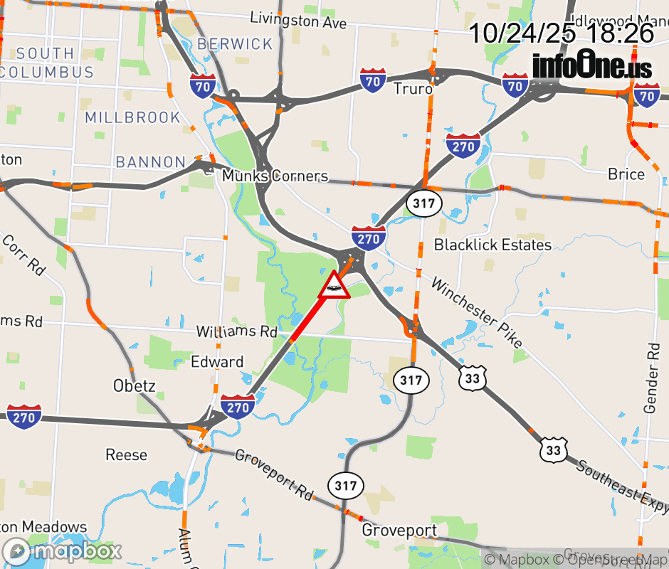 The left lane is blocked on I-270 North at US-33, due to a crash. ![]() |