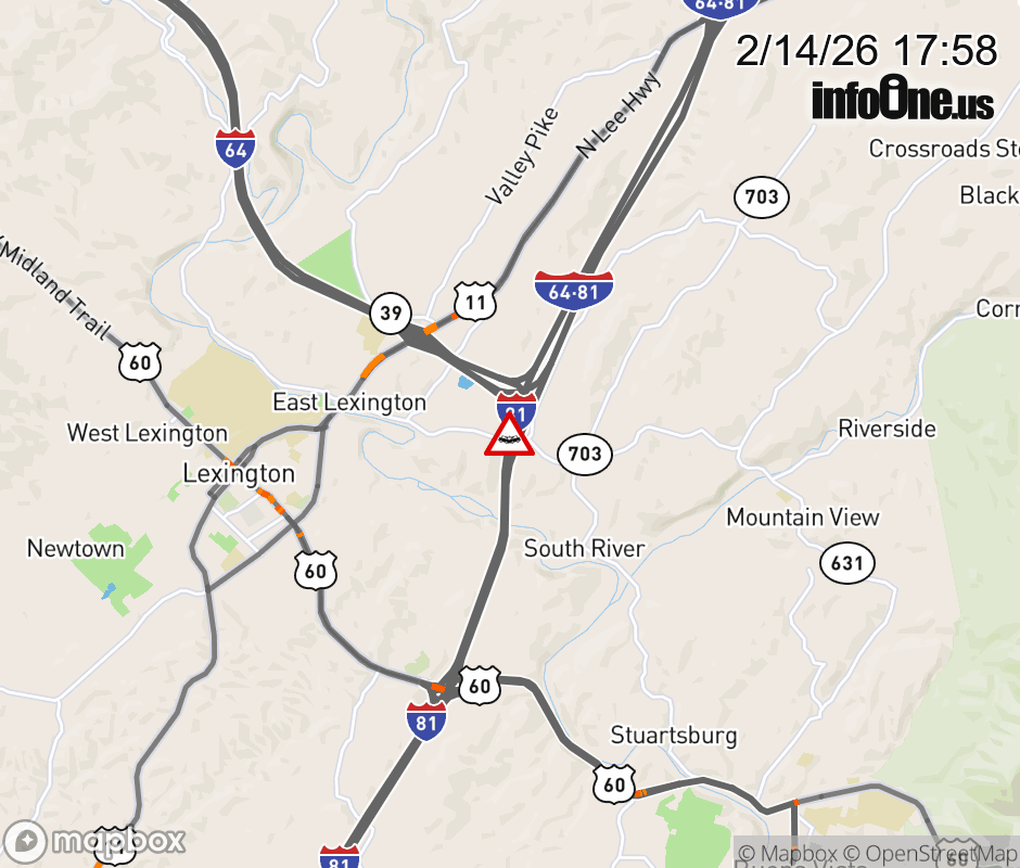 On I-81 South at mile marker 191 in the County of Rockbridge, motorists can expect delays due to a tractor trailer crash. Updated: Sat 2/14/26 5:58 PM EST ![]() Updated: Sat 2/14/26 5:58 PM EST |