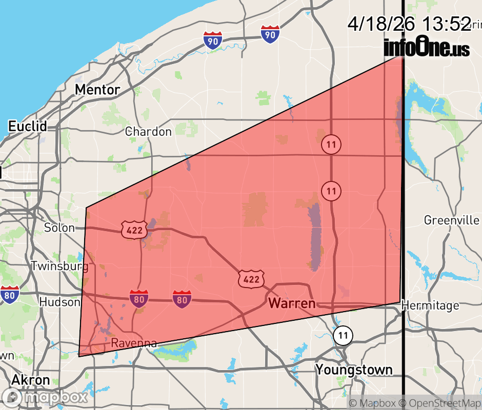 Canceled 4/18/26 2:30 PM Special Weather Statement issued April 18 at 1:50PM EDT by NWS Cleveland OH At 150 PM EDT, Doppler radar was tracking a strong thunderstorm over Mantua, or 8 miles north of Ravenna, moving northeast at 45 mph. HAZARD...Wind gusts up to 50 mph and half inch hail. SOURCE...Radar indicated. IMPACT...Gusty winds could knock down tree limbs and blow around unsecured objects. Minor hail damage to vegetation is possible. Locations impacted include... Warren, Ravenna, Kent, Niles, Streetsboro, Cortland, Newton Falls, South Russell, Lordstown, Middlefield, Garrettsville, Kinsman, North Bloomfield, Orwell, Burton, Andover, Mantua, West Farmington, Vienna Center, and Bristolville. ![]() |