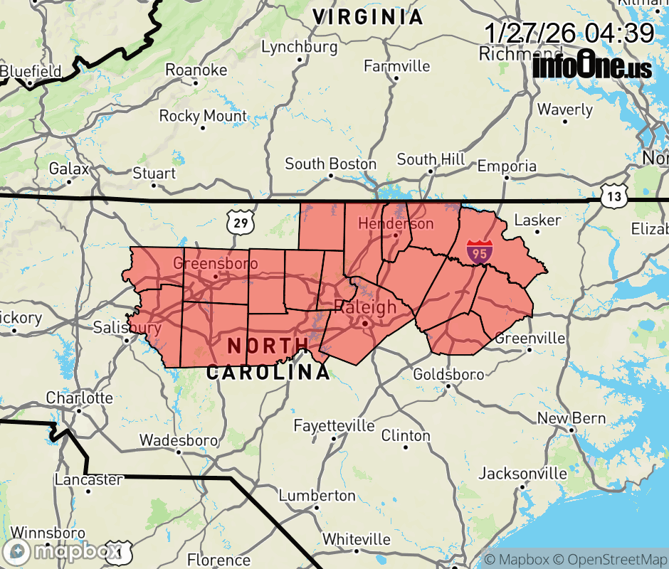 Canceled 1/27/26 9:59 AM Cold Weather Advisory issued January 27 at 4:38AM EST until January 27 at 10:00AM EST by NWS Raleigh NC * WHAT... Very cold wind chills in the single digits, with some as low as five below zero. * WHERE... The northern Piedmont and northern Coastal Plain. * WHEN... Until 10 AM EST this morning. * IMPACTS... Frostbite and hypothermia will occur if unprotected skin is exposed to these temperatures. ![]() |