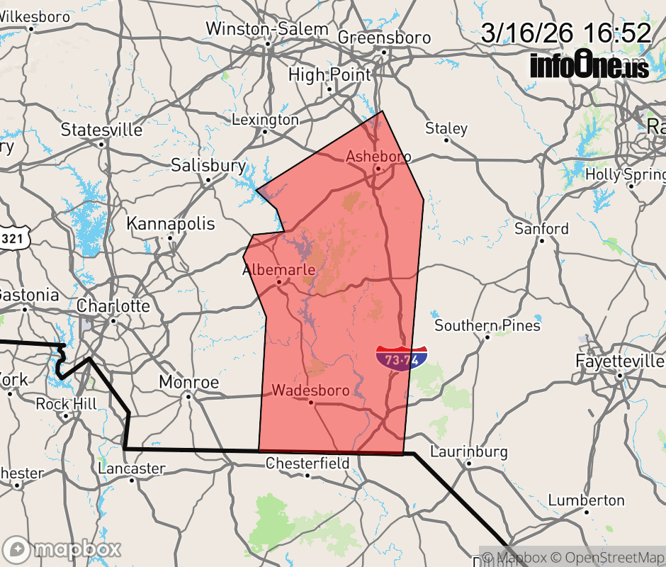Canceled 3/16/26 5:24 PM Severe Thunderstorm Warning issued March 16 at 4:51PM EDT until March 16 at 5:30PM EDT by NWS Raleigh NC SVRRAH The National Weather Service in Raleigh has issued a * Severe Thunderstorm Warning for... Northwestern Moore County in central North Carolina... Southeastern Davidson County in central North Carolina... Anson County in central North Carolina... Montgomery County in central North Carolina... Richmond County in central North Carolina... Randolph County in central North Carolina... Stanly County in central North Carolina... * Until 530 PM EDT. * At 451 PM EDT, severe thunderstorms were located along a line extending from near Rockwell to near Albemarle to 7 miles southeast of Sturdivants, moving northeast at 45 mph. HAZARD...60 mph wind gusts. SOURCE...Radar indicated. IMPACT...Expect damage to roofs, siding, and trees. * Locations impacted include... Asheboro, Albemarle, Rockingham, Wadesboro, Randleman, Troy, Badin Lake, North Carolina Zoo, Hamlet, and Biscoe. This includes Interstate 73 between Mile Markers 26 and 86. ![]() |