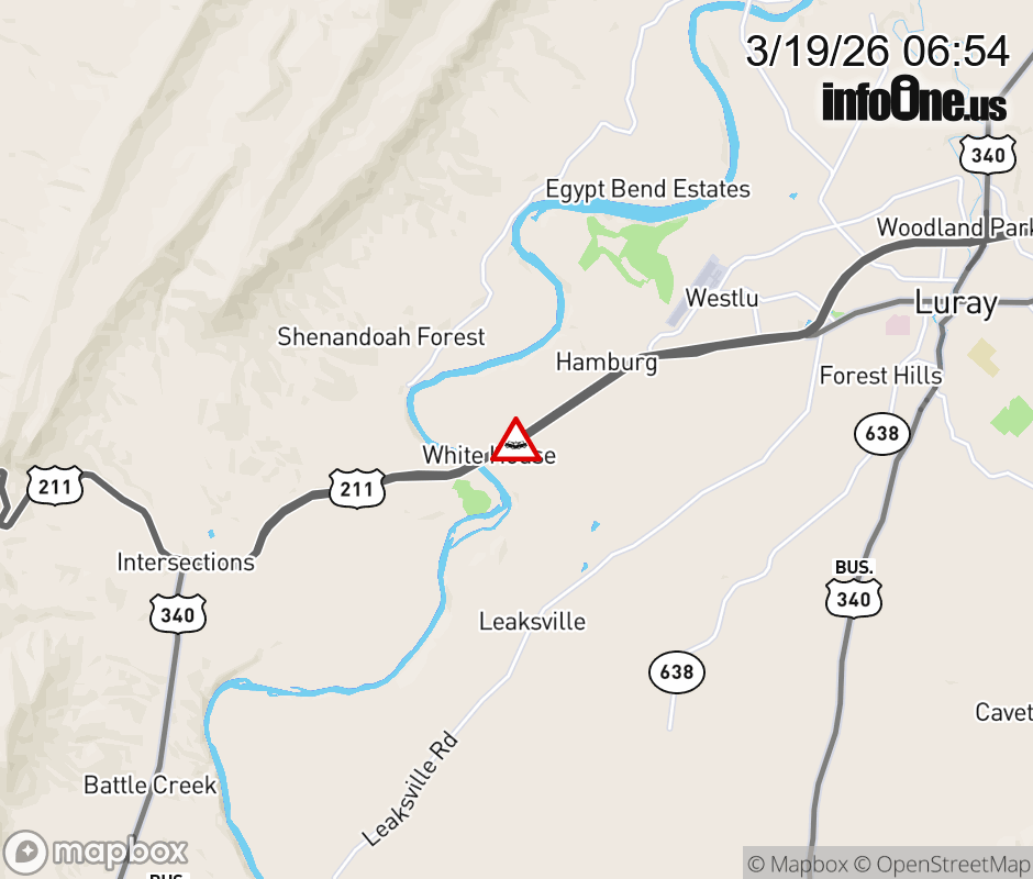 On US-211 in the County of Page, in the vicinity of Hamburg Rd; Rt. 766E/W (Page County), motorists can expect delays due to a vehicle crash. The west left shoulder and left lane are closed. Updated: Thu 3/19/26 6:54 AM EDT ![]() Updated: Thu 3/19/26 6:54 AM EDT |