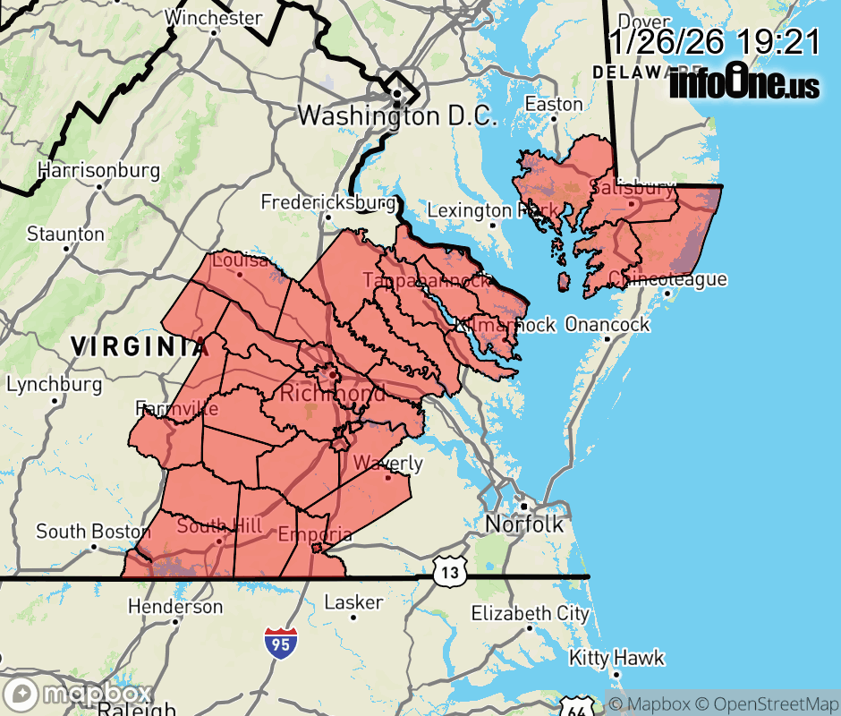 Canceled 1/27/26 2:38 AM Cold Weather Advisory issued January 26 at 7:20PM EST until January 27 at 10:00AM EST by NWS Wakefield VA * WHAT... Very cold wind chills of 5 below to 5 above expected. * WHERE... Portions of southeast Maryland and central, east central, eastern, north central, south central, and southeast Virginia. * WHEN... Until 10 AM EST Tuesday. * IMPACTS... The cold wind chills as low as 5 below zero could result in hypothermia if precautions are not taken. * ADDITIONAL DETAILS... In addition to the cold, black ice will likely develop on area roadways tonight into Tuesday morning. Use caution while traveling, especially on untreated secondary roads, bridges, and overpasses. ![]() |
