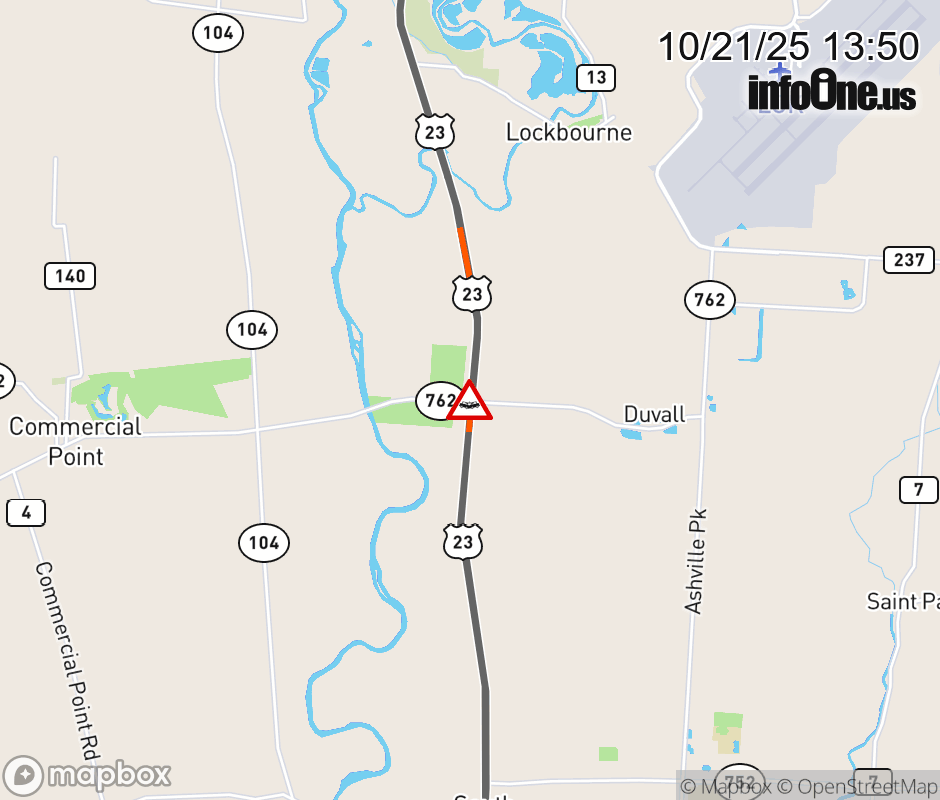 The right lane is blocked on US-23 South at SR-762, due to a crash. Updated: Tue 10/21/25 1:50 PM EDT ![]() Updated: Tue 10/21/25 1:50 PM EDT |
