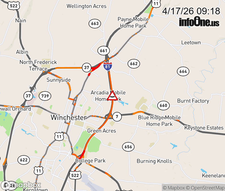 On I-81 North at mile marker 316.4 in the County of Frederick, motorists can expect delays due to a tractor trailer crash. Traffic backups are approximately 4.5 miles. Updated: Fri 4/17/26 9:18 AM EDT ![]() Updated: Fri 4/17/26 9:18 AM EDT |