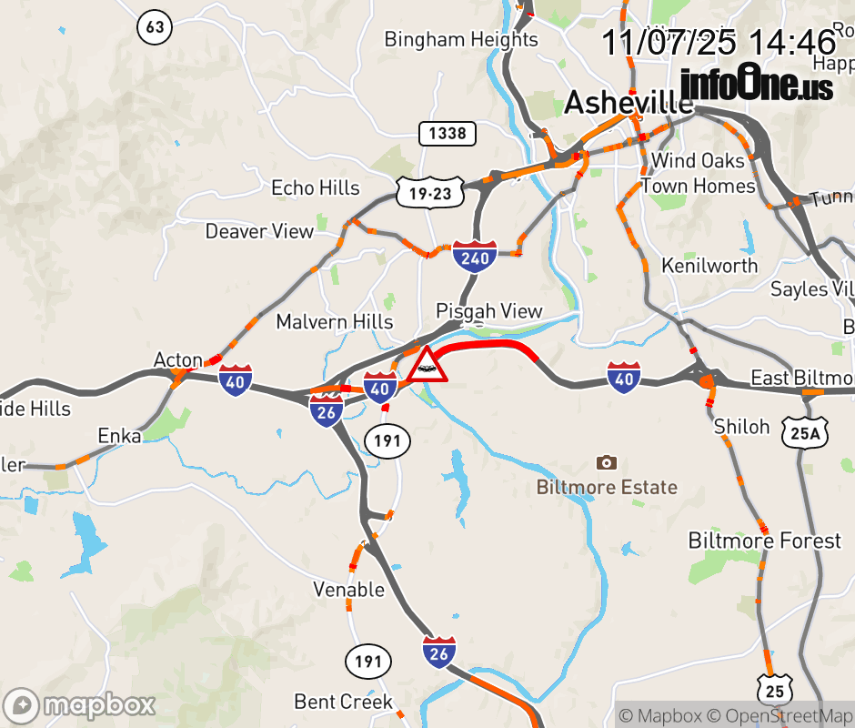 The right shoulder is closed before Exit 47, NC 191 (Brevard Rd). Updated: Fri 11/7/25 2:46 PM EST ![]() Updated: Fri 11/7/25 2:46 PM EST |