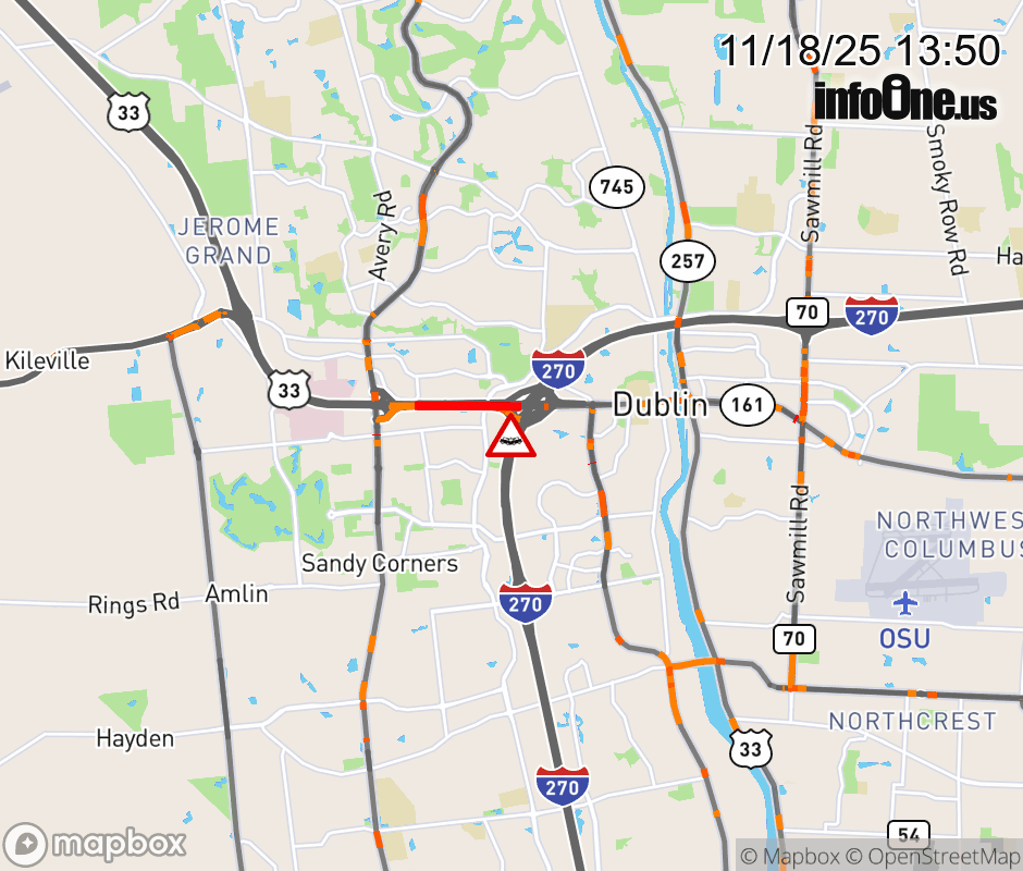The right shoulder is closed on Ramp US-33/SR-161 East to I-270 South, due to a crash. Updated: Tue 11/18/25 1:50 PM EST ![]() Updated: Tue 11/18/25 1:50 PM EST |