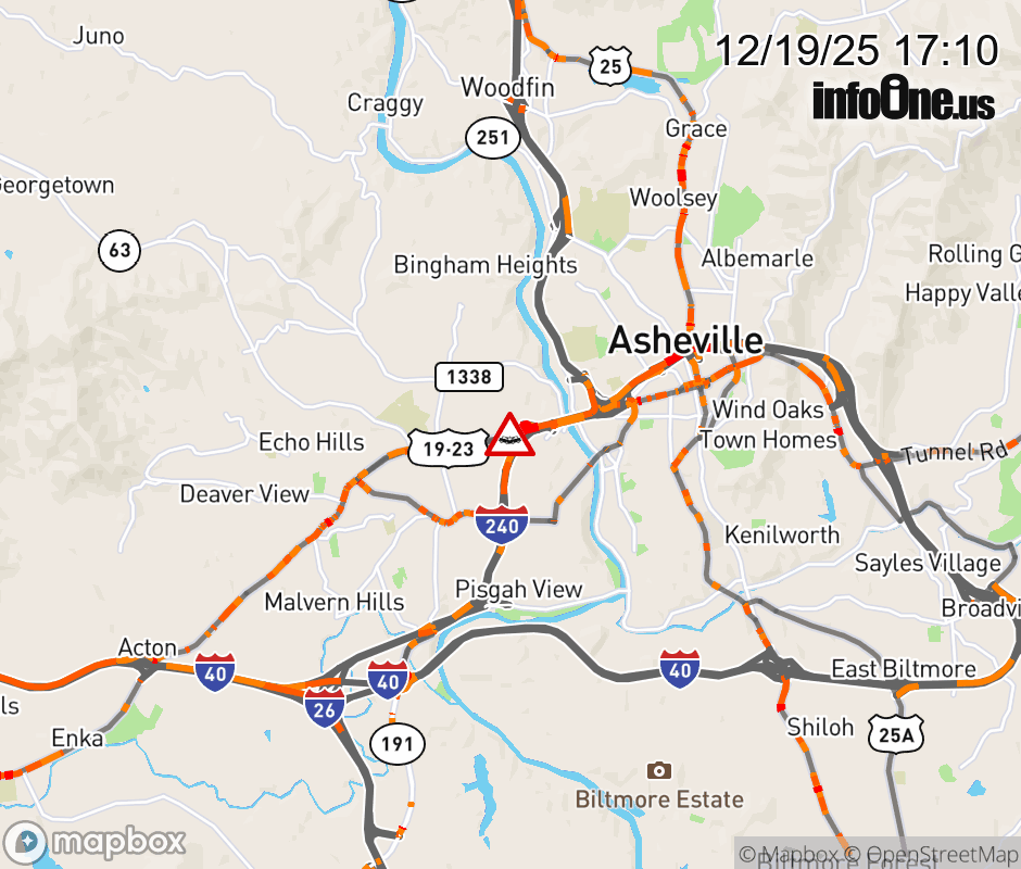 The left shoulder is closed at Exit 3A, US 74 Alt (Patton Ave). Updated: Fri 12/19/25 5:10 PM EST ![]() Updated: Fri 12/19/25 5:10 PM EST |