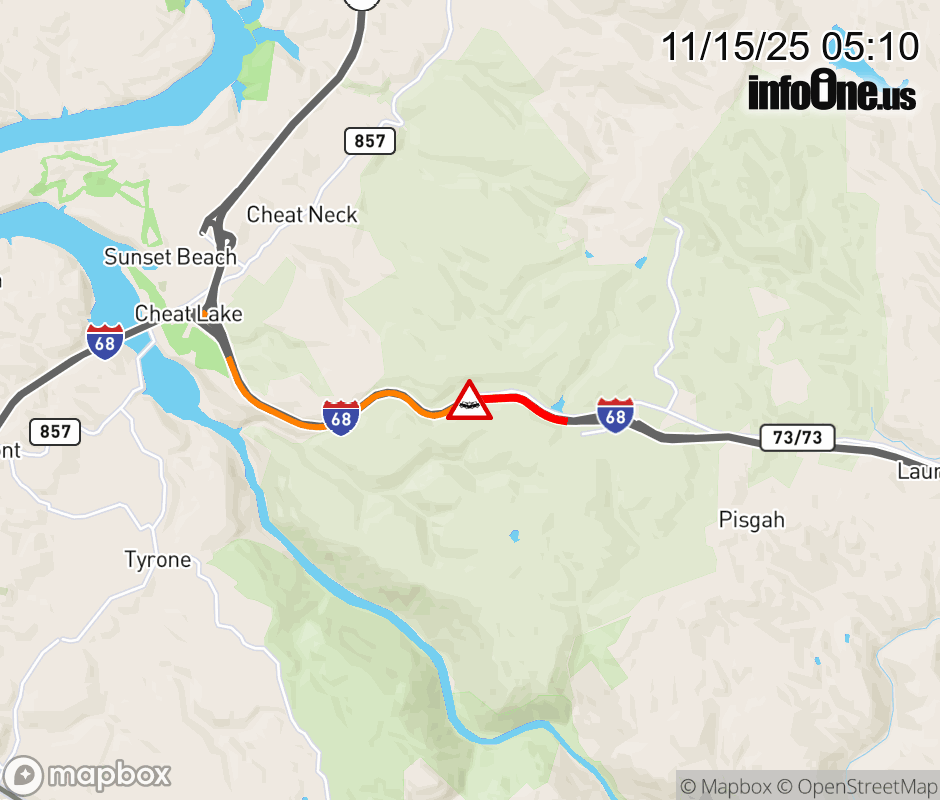 Vehicle Crash on I-68E at Mile Marker 13.5. The eastbound 2 left lanes are closed. Updated: Sat 11/15/25 5:10 AM EST ![]() Updated: Sat 11/15/25 5:10 AM EST |