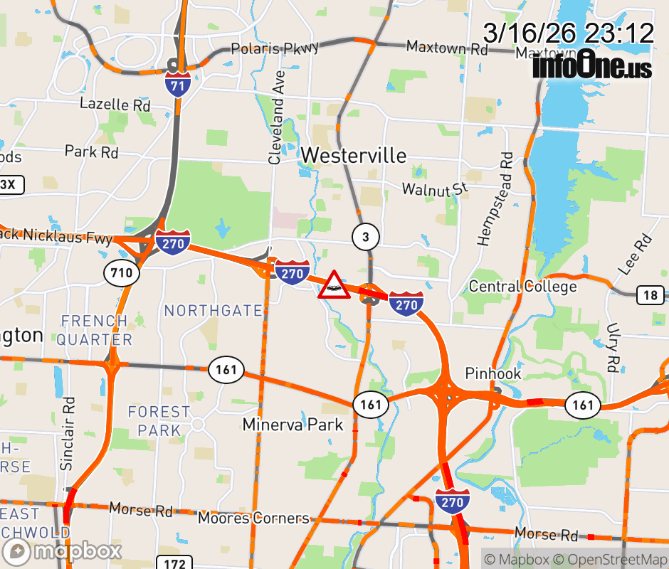 The 2 left lanes are blocked on I-270 West at SR-3 the outer lanes are blocked on I-270 East at SR-3/Westerville Pike, due to a crash. ![]() |