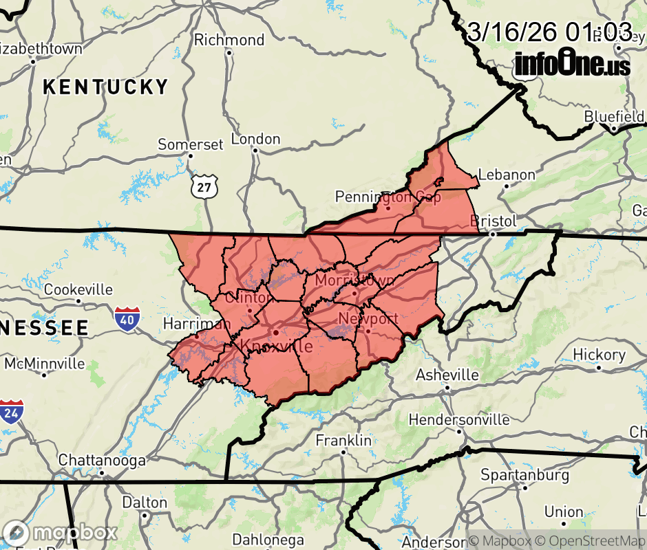 Canceled 3/16/26 4:26 AM Severe Thunderstorm Watch issued March 16 at 1:02AM EDT until March 16 at 7:00AM EDT by NWS Morristown TN SEVERE THUNDERSTORM WATCH 62 REMAINS VALID UNTIL 7 AM EDT THIS MORNING FOR THE FOLLOWING AREAS IN TENNESSEE THIS WATCH INCLUDES 17 COUNTIES IN EAST TENNESSEE ANDERSON BLOUNT CAMPBELL CLAIBORNE COCKE GRAINGER GREENE HAMBLEN HANCOCK HAWKINS JEFFERSON KNOX LOUDON ROANE SCOTT SEVIER UNION IN VIRGINIA THIS WATCH INCLUDES 4 COUNTIES IN SOUTHWEST VIRGINIA CITY OF NORTON LEE SCOTT WISE THIS INCLUDES THE CITIES OF ALCOA, ALPHA, APPALACHIA, ARTHUR, BEAN STATION, BEARDEN, BIG SOUTH FORK NATIONAL, BIG STONE GAP, BRADBURY, BYBEE, CARYVILLE, CHESTNUT HILL, CLAIRFIELD, CLINTON, COEBURN, DANDRIDGE, EAGLE FURNACE, ELGIN, ELK VALLEY, ELKMONT, EVANSTON, FAIRVIEW, FINCASTLE, GREENEVILLE, HAPPY VALLEY, HARRIMAN, HARRISBURG, HARROGATE-SHAWANEE, HARTFORD, HILTONS, HOWARD QUARTER, HUNTSVILLE, JEFFERSON CITY, JELLICO, KINGSTON, KNOXVILLE, KODAK, KYLES FORD, LA FOLLETTE, LAKE FOREST, LENOIR CITY, LONE MOUNTAIN, LOUDON, LUTTRELL, MARYVILLE, MAYNARDVILLE, MCMAHAN, MOORESBURG, MORRISTOWN, NEWPORT, NORMA, NORRIS LAKE, NORTON, OAK RIDGE, OLIVER SPRINGS, ONEIDA, PARDEE, PAULETTE, PIGEON FORGE, ROCKWOOD, ROSE HILL, ROSE HILL, ROYAL BLUE, RUSSELLVILLE, SANDLICK, SEVIERVILLE, SEYMOUR, SHARPS CHAPEL, SLICK ROCK, SMOKEY JUNCTION, SNEEDVILLE, SPRINGDALE, STRAWBERRY PLAINS, TREADWAY, WHITE OAK, WHITE PINE, AND WISE. ![]() |