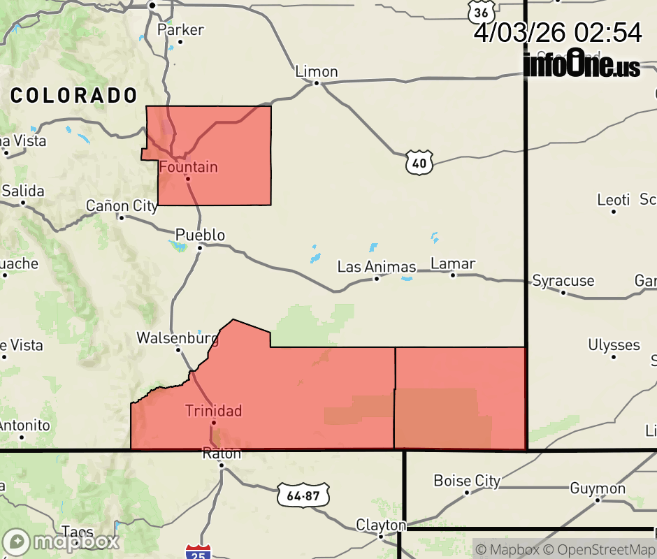 Canceled 4/3/26 4:00 PM Red Flag Warning issued April 3 at 12:53AM MDT until April 3 at 8:00PM MDT by NWS Pueblo CO The National Weather Service in Pueblo has issued a Red Flag Warning for gusty winds and low relative humidity, which is in effect from 11 AM this morning to 8 PM MDT this evening. * AFFECTED AREA... Fire Weather Zones 226, 233 and 237. * WINDS... North 15 to 20 mph with gusts up to 35 mph. * RELATIVE HUMIDITY... As low as 14 percent. * IMPACTS... Fires will catch and spread quickly. Exercise extreme caution with any outdoor burning. ![]() |