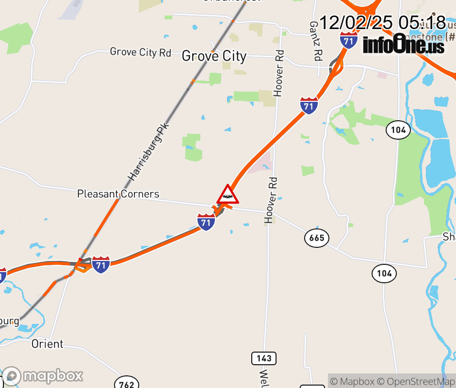 All lanes are closed on I-71 South at SR-665/London - Groveport Rd, due to a crash. ![]() |