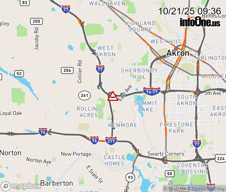 The right shoulder is blocked on I-76 East at I-77/I-76, due to a crash. Updated: Tue 10/21/25 9:36 AM EDT ![]() Updated: Tue 10/21/25 9:36 AM EDT |